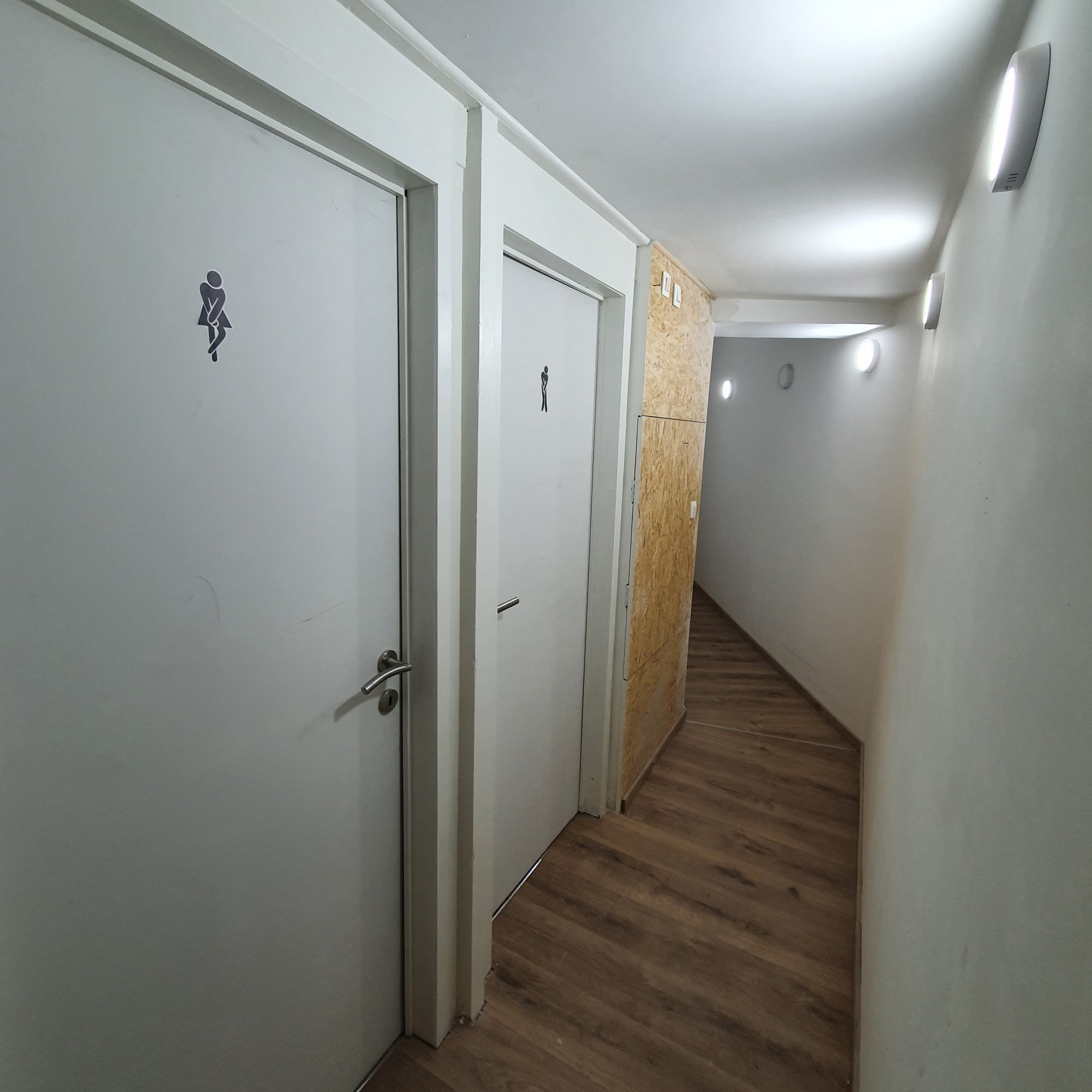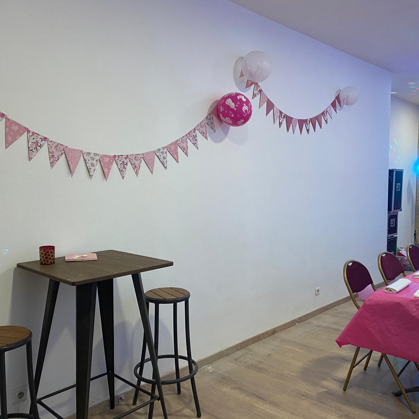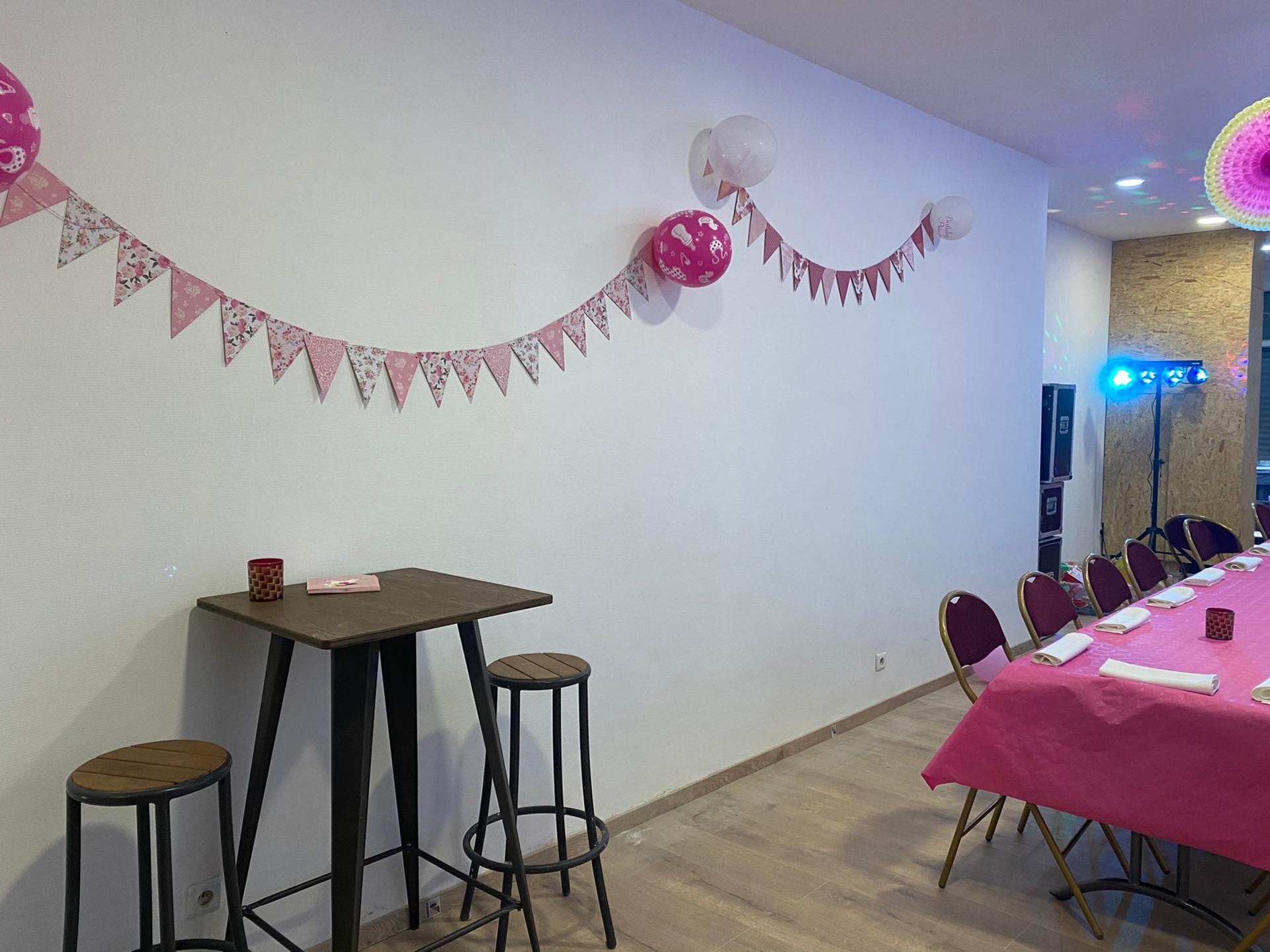 La salle est équipée d’une cuisine, de sanitaires homme et femme, d’un espace bar et d’une arrière salle avec un accès extérieur pour les fumeurs.